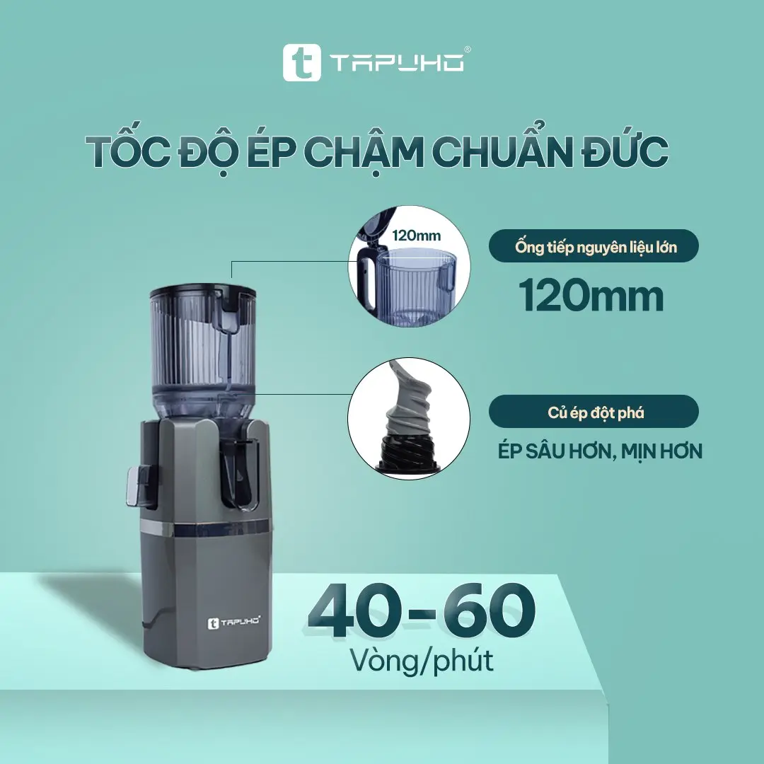 - Máy ép chậm Tapuho giữ trọn enzyme, vitamin, khoáng chất nhờ tốc độ quay thấp, không sinh nhiệt.