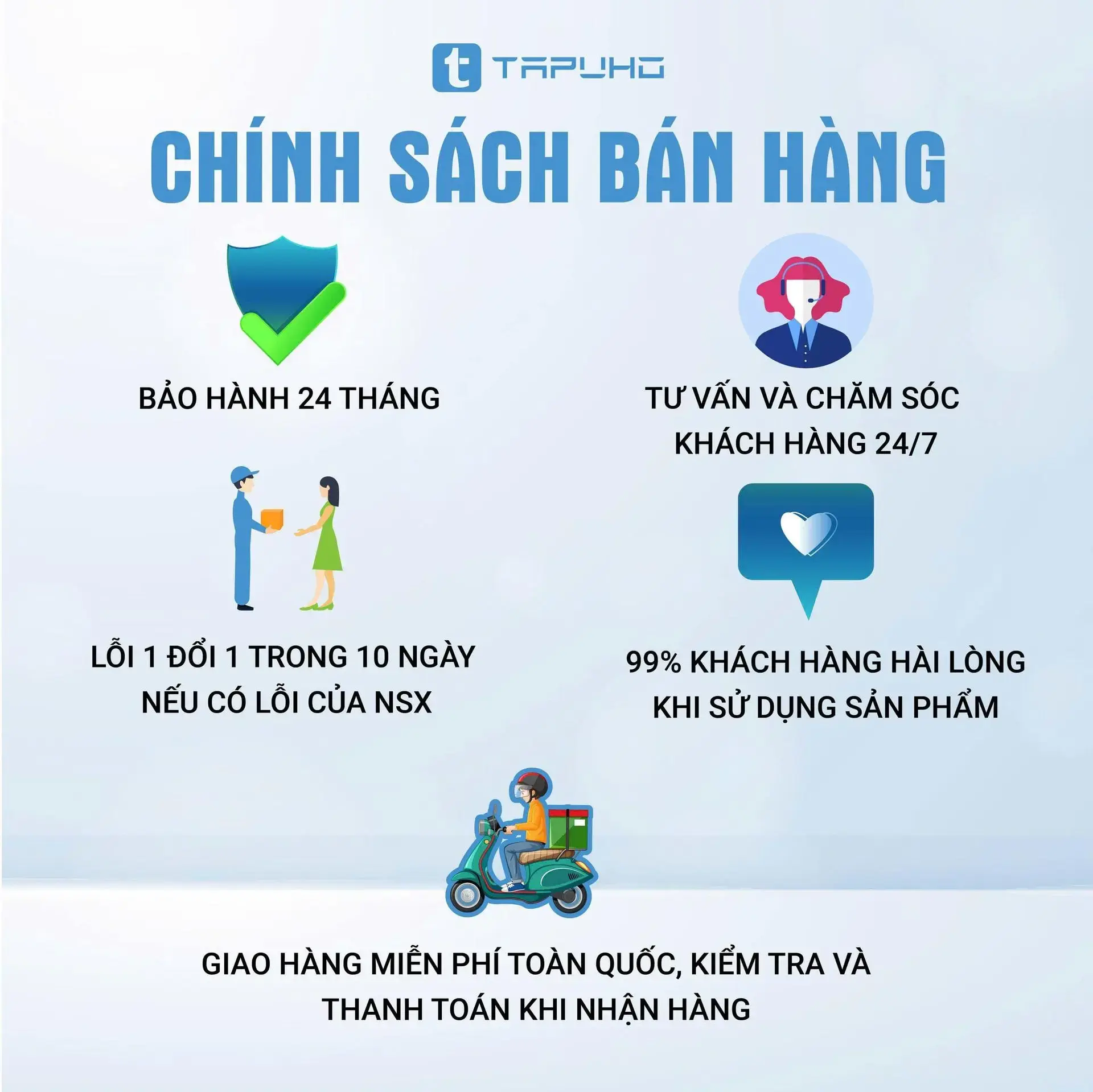 Khi lựa chọn sản phẩm của TAPUHO, khách hàng không chỉ yên tâm về chất lượng mà còn được đồng hành với dịch vụ hậu mãi TAPUHO chuyên nghiệp và tận tâm:
