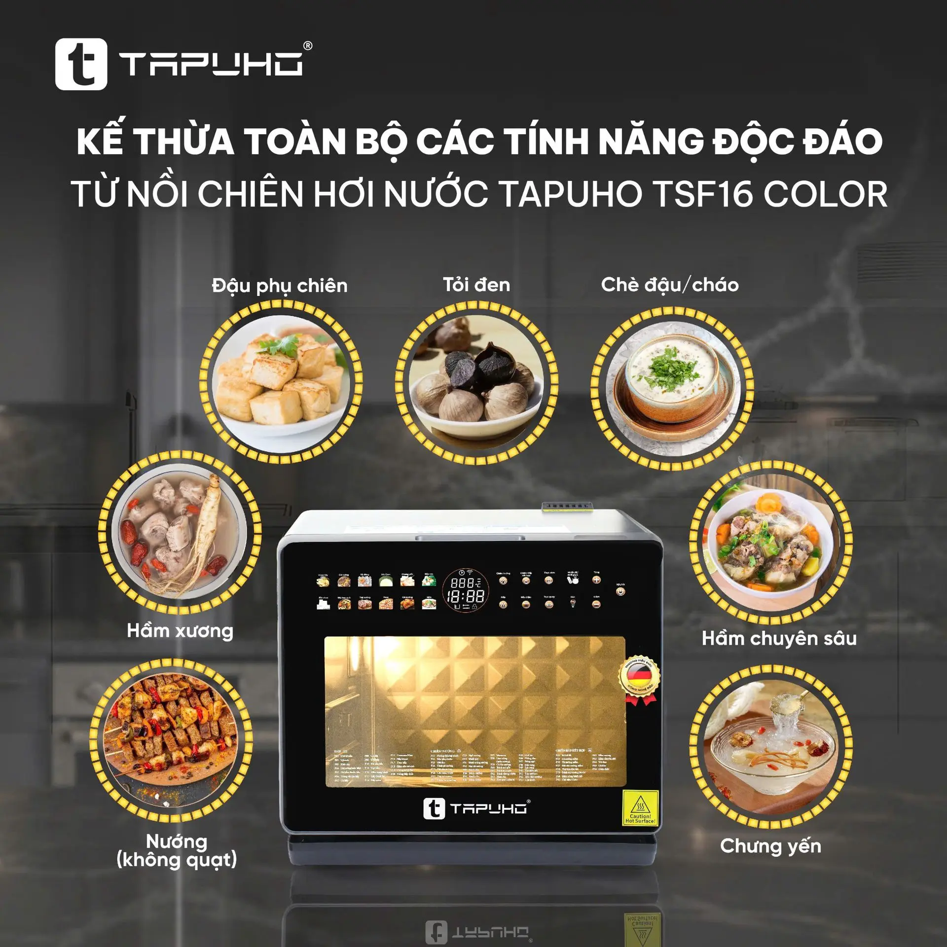 TAPUHO TMC20 PrimeAI nổi bật nhờ công nghệ nấu 5 trong 1, tích hợp hấp, chiên, chiên-hấp, hầm và nấu chậm trong một thiết bị. Bạn có thể chuẩn bị từ món hấp giữ dưỡng chất, các món chiên vàng giòn ít dầu, đến các món hầm mềm sâu vị mà không cần thêm nồi chảo khác.