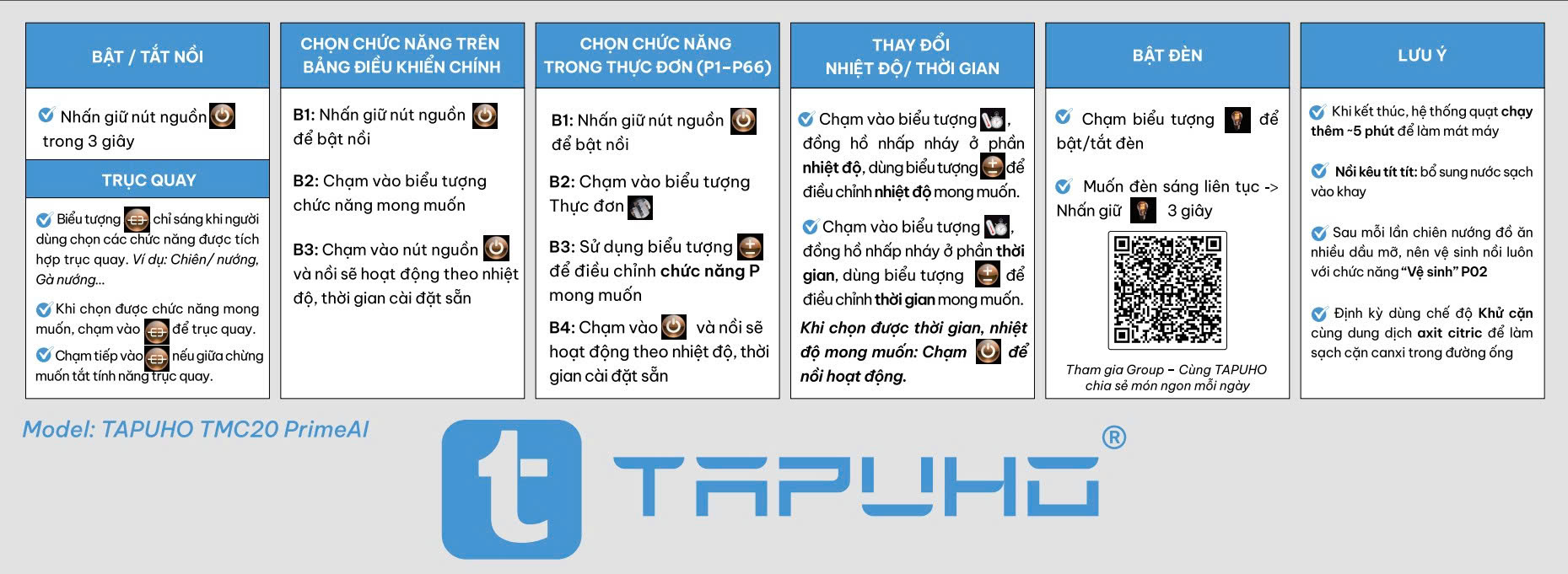 Khi mang TAPUHO TMC20 PrimeAI về gian bếp của mình, bạn sẽ cảm nhận giá trị vượt xa hơn rất nhiều so với số tiền đầu tư – bởi đó không chỉ là một chiếc nồi, mà là người trợ lý thông minh giúp bạn tận hưởng niềm vui nấu nướng mỗi ngày.