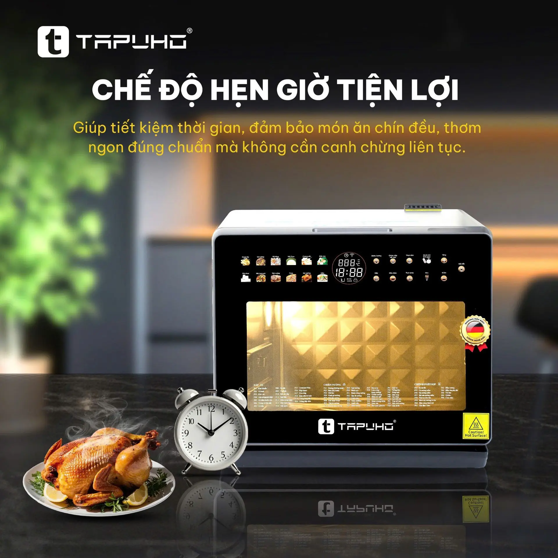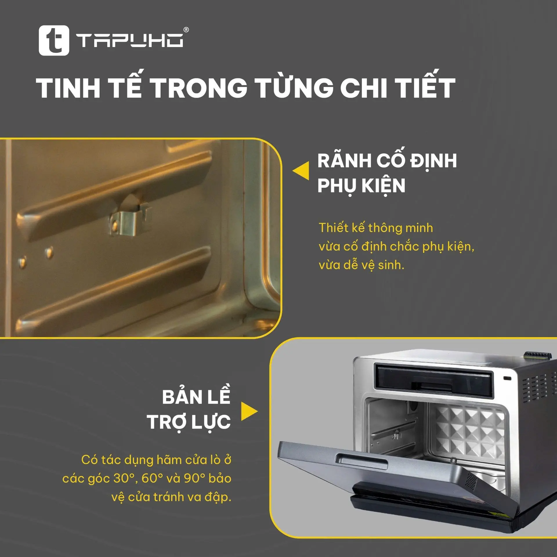 Khi mua TAPUHO TMC20 PrimeAI, người dùng nhận ngay bộ phụ kiện inox 304 cao cấp gồm: khay hấp, khay nướng, rá chiên, trục quay, giỏ quay, nhông quay, dây buộc gà, dụng cụ lấy khay, găng tay chống nóng, cùng sách công thức nấu ăn.