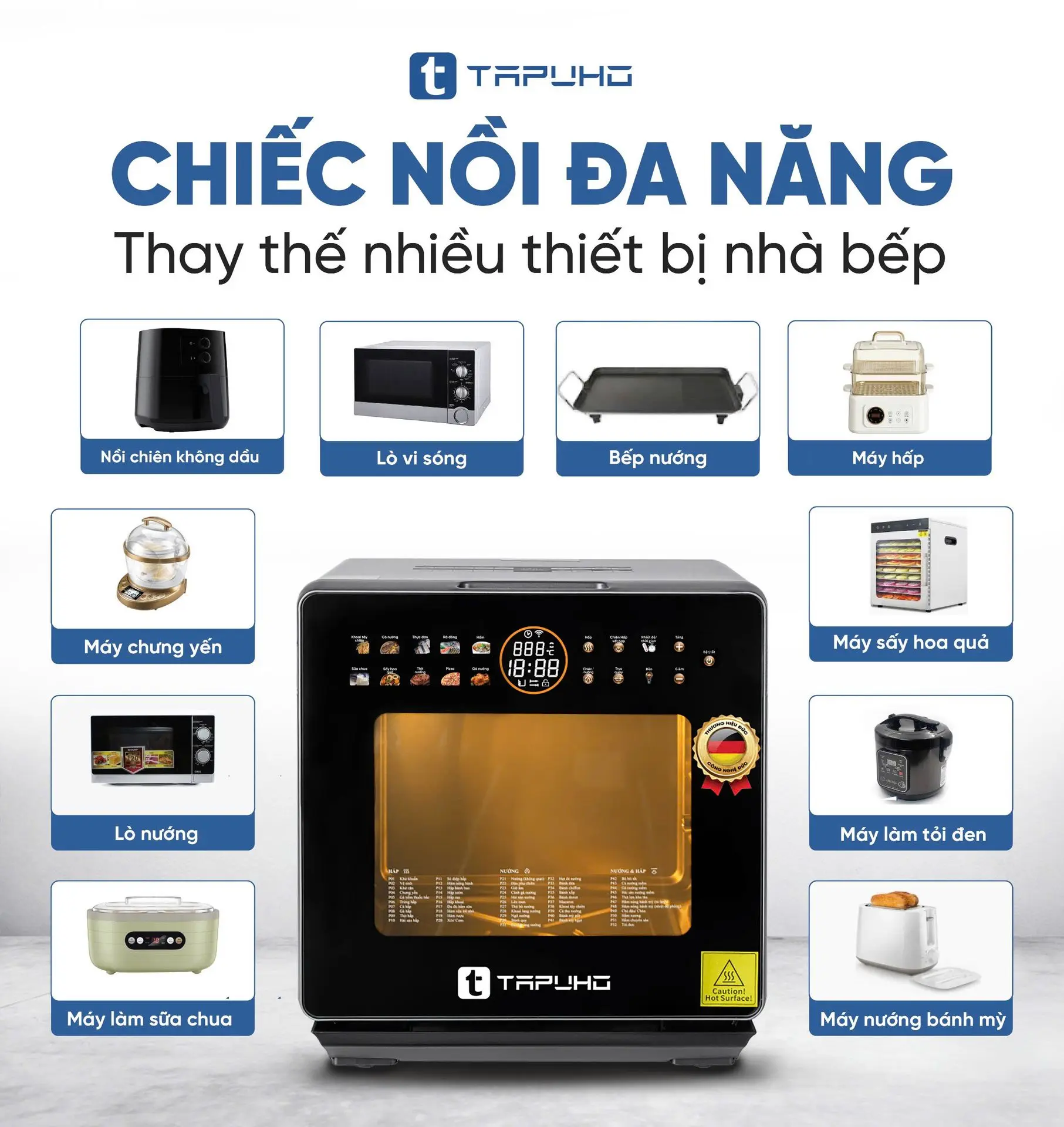 Nỗi lo không gian bếp chật hẹp không đủ không gian để chứa các thiết bị nhà bếp sẽ không còn nữa khi TAPUHO LUXURY STEAM FRYER TSF16 COLOR PLUS có thể sử dụng chức năng tương đương với hơn chục thiết bị nhà bếp khác nhau như : nồi chiên không dầu, nồi hấp, nồi áp suất, máy sấy hoa quả, máy ủ sữa chua, lò nướng, lò vi sóng, máy làm bỏng ngô, máy nướng bánh mỳ, nồi chưng yến, máy làm tỏi đen... và đặc biệt với tính năng đa dạng như vậy sẽ giúp chúng ta tiết kiệm được rất nhiều chi phí mua sắm, thời gian vệ sinh bảo dưỡng.