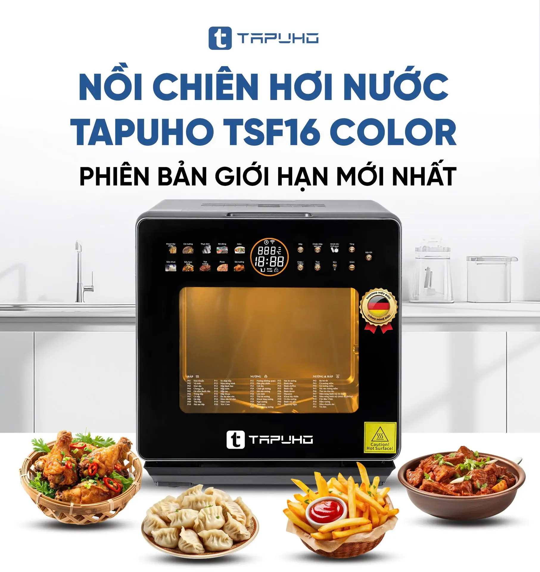 là sản phẩm nồi chiên hơi nước phiên bản giới hạn đời mới nhất năm 2024 của TAPUHO - thương hiệu gia dụng cao cấp đến từ Đức. Đây là dòng sản phẩm cao cấp được ra đời tiếp theo sau sự thành công vang dội từ người anh cùng dòng là TAPUHO TSF16 - sản phẩm mang tính đột phá, bùng nổ công nghệ với sự kết hợp giữa nồi chiên không dầu (công nghệ rapid air) và nồi hấp (công nghệ hơi nước siêu nhiệt Steam Extra) mang đến sự tiện lợi cho khách hàng, ngoài ra nó còn là sự kết hợp 4 tính năng trong 1, đó là tính năng Hấp - Chiên không dầu - Chiên hấp kết hợp - Hầm và đặc biệt có những chức năng chỉ có trên TAPUHO TSF16 COLOR PLUS mà chưa từng có trên bất kỳ sản phẩm cùng loại nào trên thị trường.