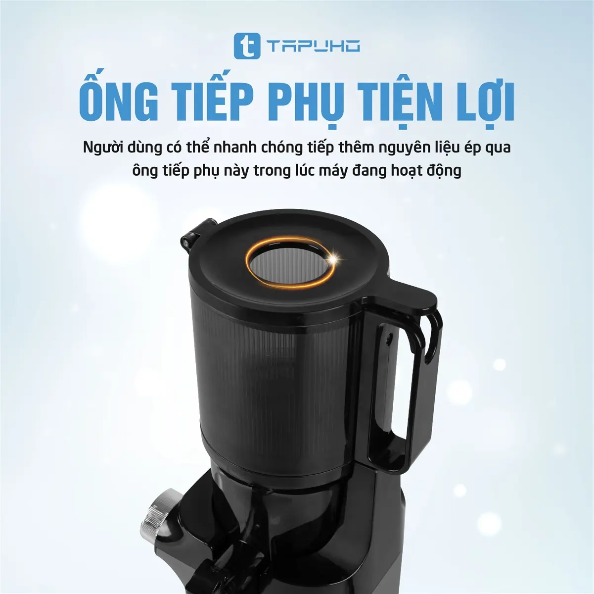 Máy ép chậm TAPUHO TSJ66 có ống tiếp nguyên liệu lớn với miệng ống có đường kính lên tới 108mm giúp bạn cho nguyên liệu vào dễ dàng và có thể ép nhiều loại trái cây trong cùng một lần. Người sử dụng không tốn nhiều thời gian cắt, bổ nguyên liệu quá nhỏ như ở các dòng máy có ống tiếp nguyên liệu nhỏ.