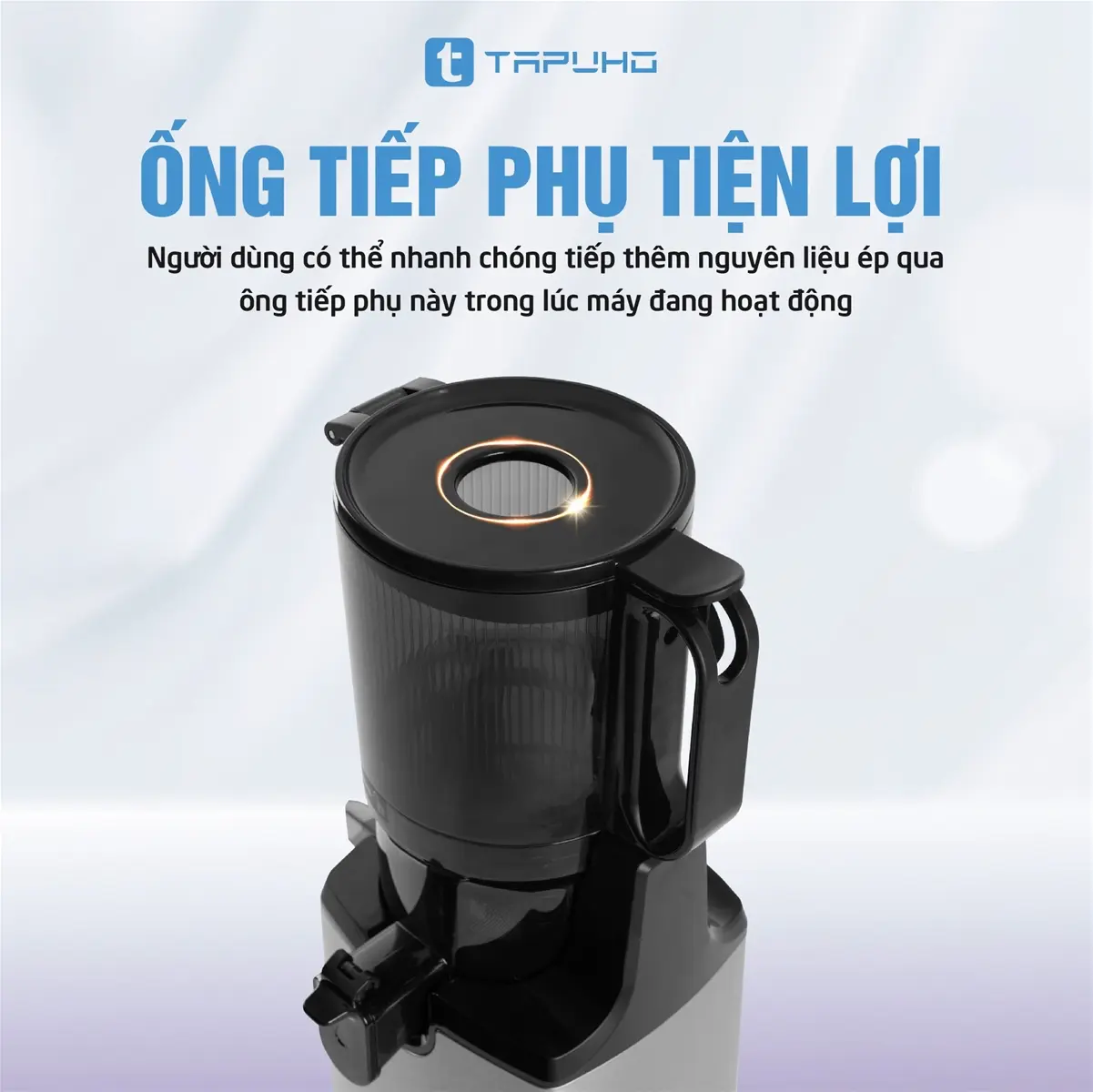 Máy ép chậm TAPUHO TSJ68 có ống tiếp nguyên liệu lớn với miệng ống có đường kính lên tới 130mm giúp người dùng có thể ép nguyên quả, cho nguyên liệu vào dễ dàng và có thể ép nhiều loại trái cây trong cùng một lần. Người dùng sẽ không tốn nhiều thời gian để cắt, bổ nguyên liệu quá nhỏ như ở các dòng máy có ống tiếp nguyên liệu nhỏ.
