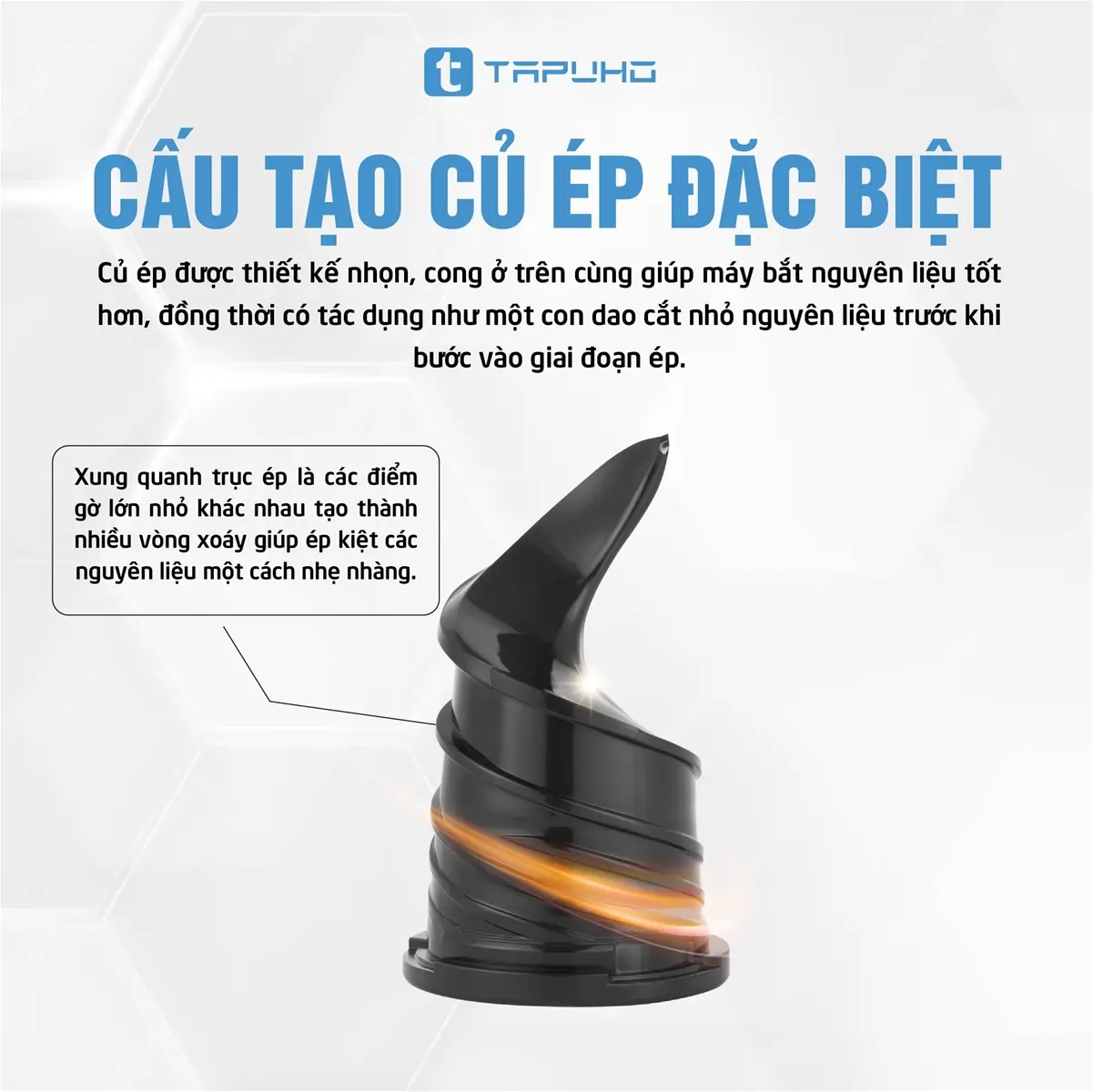 Củ ép được thiết kế nhọn giúp máy bắt nguyên liệu tốt hơn. Xung quanh trục ép là các điểm gờ lớn nhỏ khác nhau tạo thành nhiều vòng xoáy giúp ép kiệt các nguyên liệu một cách nhẹ nhàng.