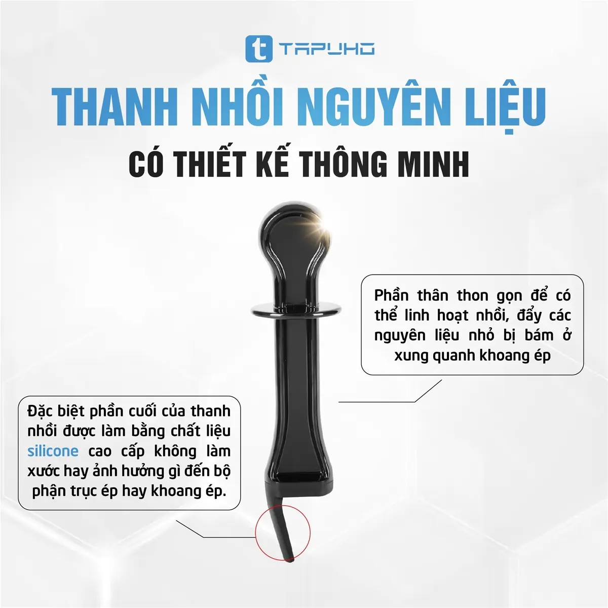 Thanh nhồi nguyên liệu có phần thân thon gọn để có thể linh hoạt nhồi, đẩy nguyên liệu bị bám ở xung quanh khoang ép và đặc biệt phần cuối của thanh nhồi được làm bằng chất liệu silicone cao cấp không làm xước hay ảnh hưởng gì đến bộ phận trục ép hay khoang ép.