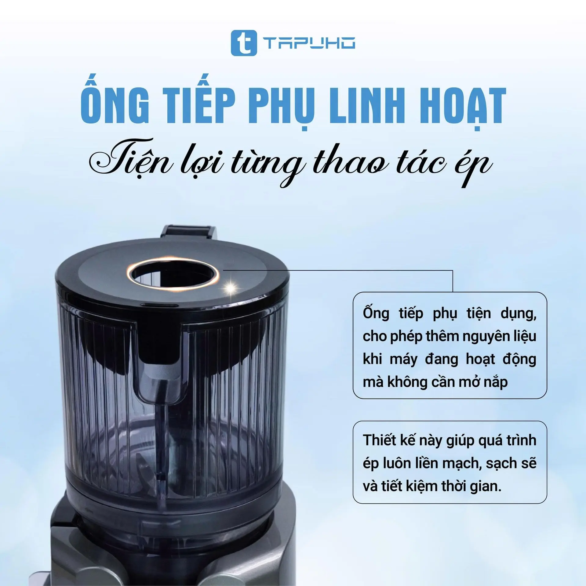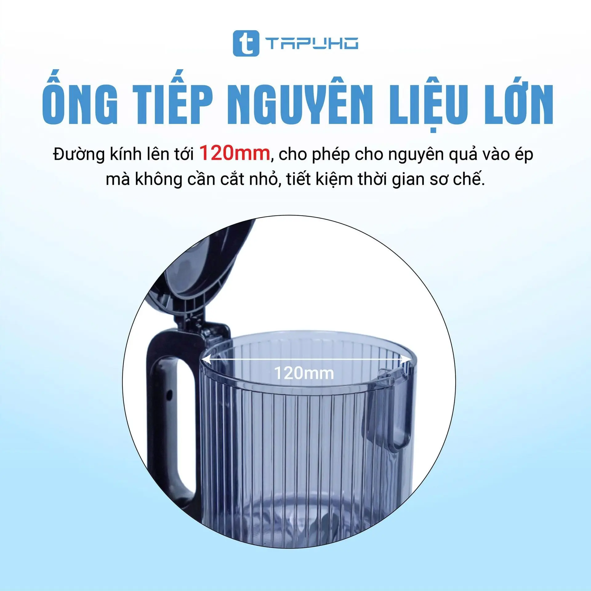 Ống tiếp liệu của TAPUHO TSJ80 DUAL có đường kính lên tới 120mm, cho phép cho nguyên quả vào ép mà không cần cắt nhỏ, tiết kiệm thời gian sơ chế và dễ dàng ép đa dạng các loại trái cây, rau củ.